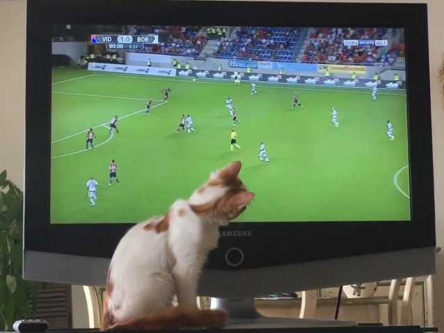 Un chaton Turc de Van découvre la télévision et a l'air d'apprécier le match de football qui y est diffusé. Le chat suit du regard le ballon et cherche même à l'attraper en donnant des coups sur la télévision. C'est un moment amusant mais qui peut être dangereux pour le matériel.