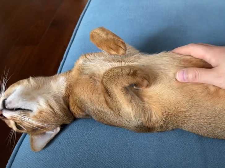 Allongé sur le dos, un chat de race Abyssin se fait caresser le ventre par son propriétaire. Une forte complicité existe entre ce dernier et l'animal. D'ailleurs, le félin n'hésite pas à faire les yeux doux à son maitre afin de l'attendrir. Une confiance totale a l'air d'exister entre les compères.