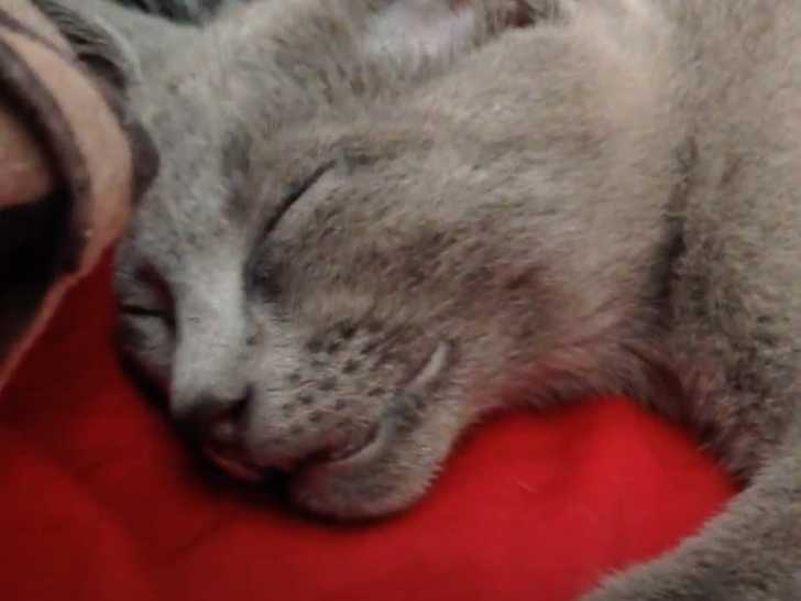 Cette vidéo montre un chat Bleu Russe en train de dormir aux côtés d'un chien avec qui il vit. Le petit félin semble même en train de parler dans son sommeil, puisque sa bouche est en mouvement. De fait, il est possible qu'il soit alors en train de rêver.