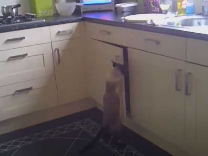 Cette vidéo amateur insolite montre un chat appelé Oscar capable d'ouvrir la porte d'un placard de cuisine. Alors que sa propriétaire fait le ménage, l'animal s'assure qu'elle détourne son attention pour mettre son plan à exécution. Il se dirige vers le placard et s'y faufile de façon discrète, soit pour se cacher, soit pour y chercher une friandise appétissante.