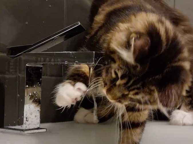 S'il est couramment admis que les chats n'aiment pas être mouillés, cela ne semble pas être le cas de ce chat Maine Coon. En effet, dans un premier temps, il boit avec aisance l'eau qui sort du robinet, puis il décide de fermer ce dernier en appuyant dessus avec une patte.