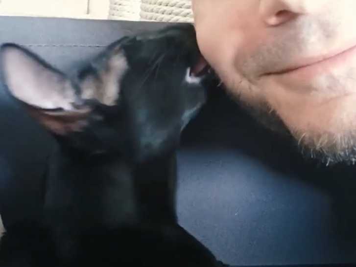Cette vidéo montre un adorable chat de race Oriental Shorthair en train de faire des bisous à son maitre. En effet, le félin est installé à côté de son propriétaire dans le canapé et lèche la joue de ce dernier avec beaucoup d'amour, pour le plus grand bonheur des deux compères. Un très beau moment de complicité et de tendresse.