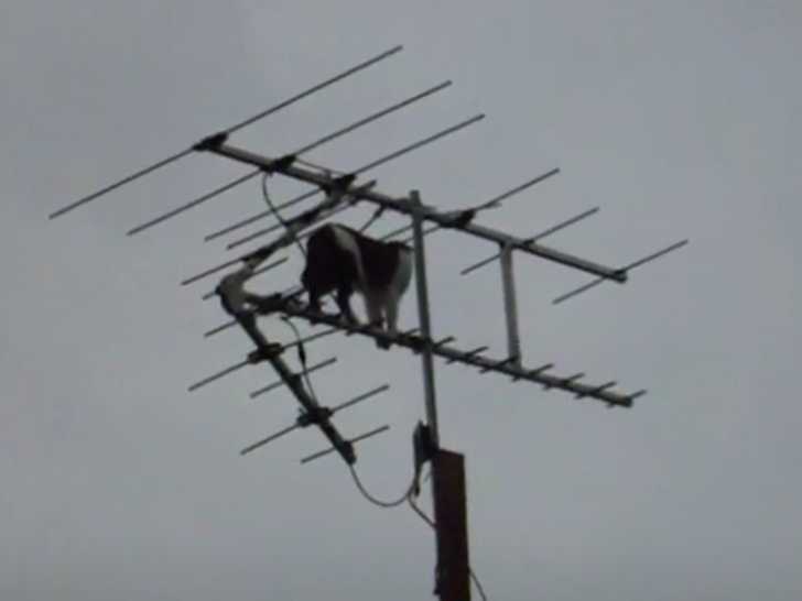 Cette vidéo montre un chat perché à plusieurs mètres de haut. En effet, il est coincé sur une antenne de télévision. Pour s'en sortir, il descend par le poteau, jusqu'à sauter sur un toit. Une sacrée aventure pour ce félin !