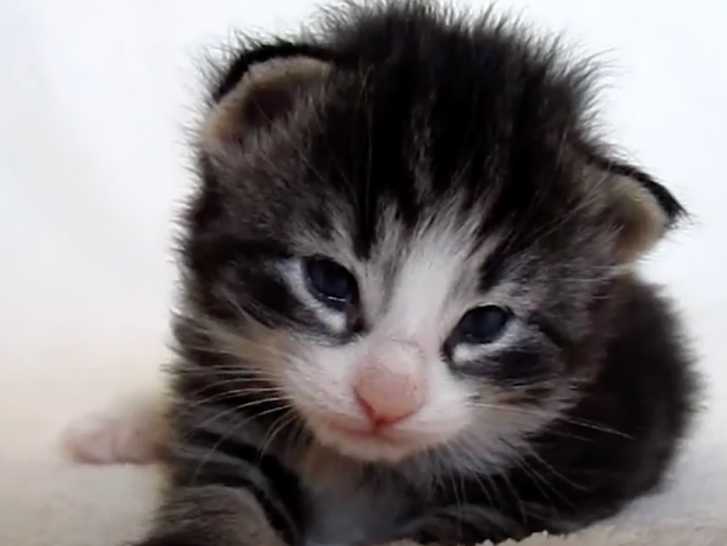Adorable ! Cette vidéo montre un chaton de 17 jours de race Norvégien en train de tenter de faire quelques pas. Ces premiers pas sont très timides mais le petit félin semble courageux, toujours sous l'oeil protecteur de son maitre.