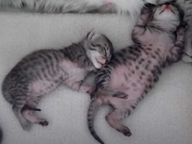 La cohabitation entre plusieurs chats peut très bien se passer comme peut s'avérer compliquée. Cette vidéo montre des magnifiques chatons de race Mau Egyptien qui sont installés les uns à côté des autres pour y effectuer une sieste. Ils semblent s'entendre à merveille et adorer passer ces instants ensemble allongés cote à cote : ils sont collés et semblent se tenir chaud.