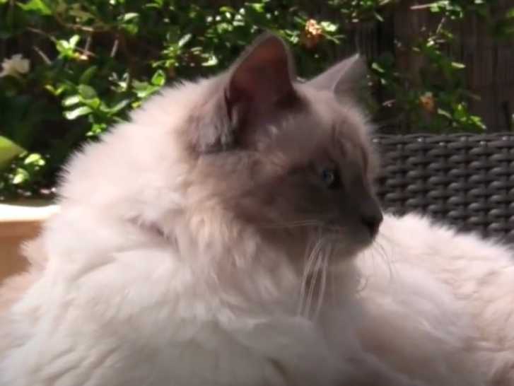Cette vidéo montre un chat de race Sacré de Birmanie à plusieurs moments de sa journée. En effet, le félin se repose dans un premier temps sur la table du jardin, puis, il réaliser sa toilette dans le salon au sein de la maison de son maitre, pour terminer par jouer avec des accessoires pour chats, toujours avec la complicité de son propriétaire.
