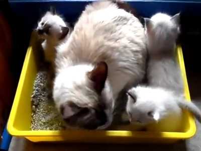 Ces adorables chatons Ragdoll découvrent la litière avec leur maman, qui essaie de leur apprendre la propreté. En effet, même si les chats cherchent naturellement un endroit qu'ils peuvent gratter pour faire leurs besoins, ils prendront plus facilement l'habitude d'utiliser la litière si leur mère leur montre l'exemple le plus tôt possible.