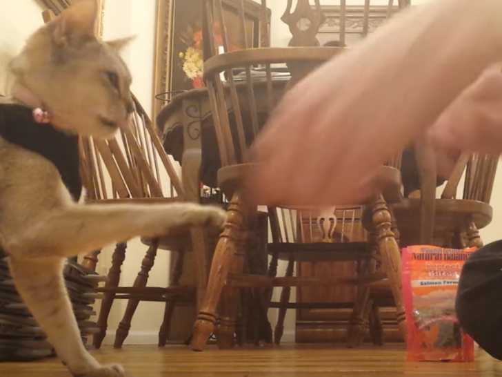 Insolite ! Qui a dit que les chats ne pouvaient pas être dressés comme des chiens ? Cette vidéo prouve que cela est possible ! En effet, un chat de race Singapura obéit à son maitre tel un chien. Ce dernier lui apprend, à l'aide de gourmandises, à se mettre debout sur ses pattes arrières. Le félin semble adorer être dressé pour faire des petits tours.