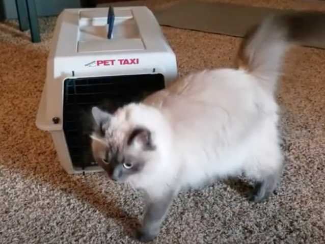 Cette vidéo montre un chat Balinais très calme à l'idée d'aller chez le vétérinaire. En effet, le félin entre dans la boîte de transport sans aucune crainte ni réticence.