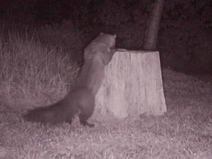 Cette vidéo montre une fouine en train de tourner autour d'une souche d'arbre. Difficile de dire ce qui peut autant l'attirer : probablement de la nourriture. Toutefois, elle ne semble pas tranquille, et pour cause : elle a probablement repéré le chat qui l'observe à distance, et qui finit au bout d'un moment par la chasser.