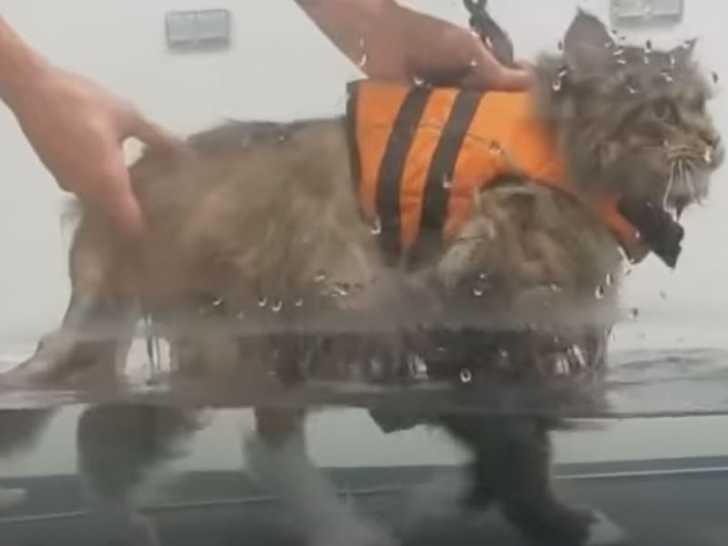 Cette vidéo montre une séance de rééducation d'un chat qui a été opéré pour une luxation de la rotule. Il effectue un premier exercice de marche sur tapis roulant en présence d'un professionnel de la santé féline. Ensuite, le même exercice est proposé avec de l'eau. Ces exercices de physiothérapie sur tapis roulant et d'hydrothérapie pour chat sont proposés par le Centre Hospitalier Vétérinaire Fregis, à Paris en France.