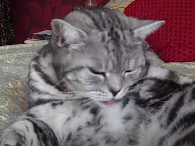 Cette vidéo montre un chat de race British Shorthair en train de faire sa toilette. En effet, le félin est allongé confortablement et s'occupe de nettoyer ses pattes.