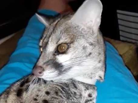 Cette vidéo montre un chat Genetta en train de faire sa toilette. En effet, le félin est positionné sur les genoux de son propriétaire et prend le temps de se toiletter.