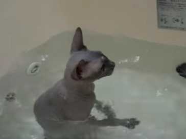 Un petit Sphynx semble apprécier de prendre un bain et reste tremper sans dire un mot. Le plus étonnant est de le voir jouer avec l'eau avec ses pattes comme ont l'habitude de le faire les chiens. C'est une aubaine pour ses maîtres car le Sphynx demande a être lavé plus souvent du fait qu'il ne possède pas de poil.