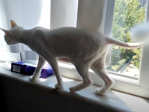 Cette vidéo montre un chat de race Anatoli en train de se balader dans l'appartement. Le félin vient d'être tondu. Cela semble faire rire ses propriétaires.