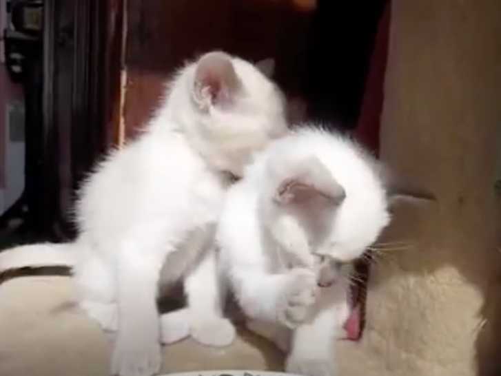 Cette vidéo est très craquante. En effet, trois chatons Tonkinois semblent s'adorer. Les petits compères sont installés sur l'arbre à chat et se font la toilette mutuellement avec une grande affection.