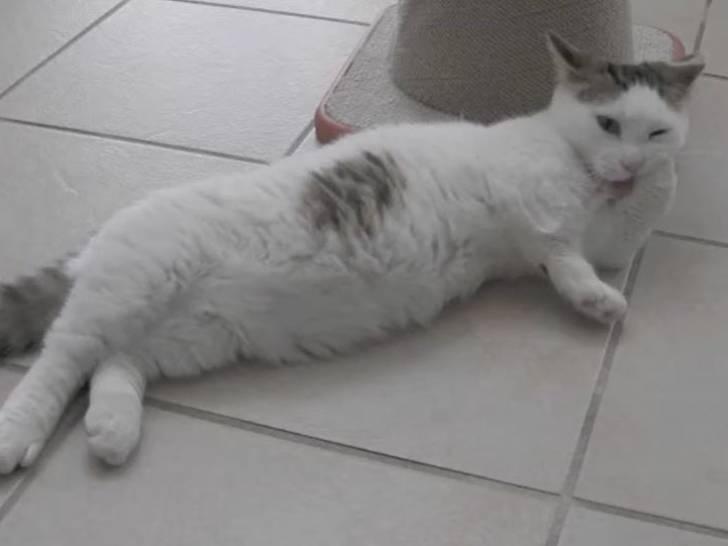 Cette vidéo montre un chat Kinkalow, croisé American Curl et Munchkin, qui réalise sa toilette quotidienne. Allongé sur le carrelage, au pied d’un arbre à chat, il commence par se lécher scrupuleusement la patte et semble profiter pleinement de ce moment de détente.