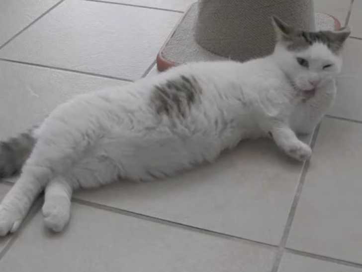 Cette vidéo montre un chat qui réalise sa toilette quotidienne. Il s’agit d’un Kinkalow, une race encore expérimentale issue du croisement de l’American Curl et du Munchkin. Allongé sur le carrelage, au pied d’un arbre à chat, il commence par se lécher scrupuleusement la patte et semble profiter pleinement de ce moment de détente.