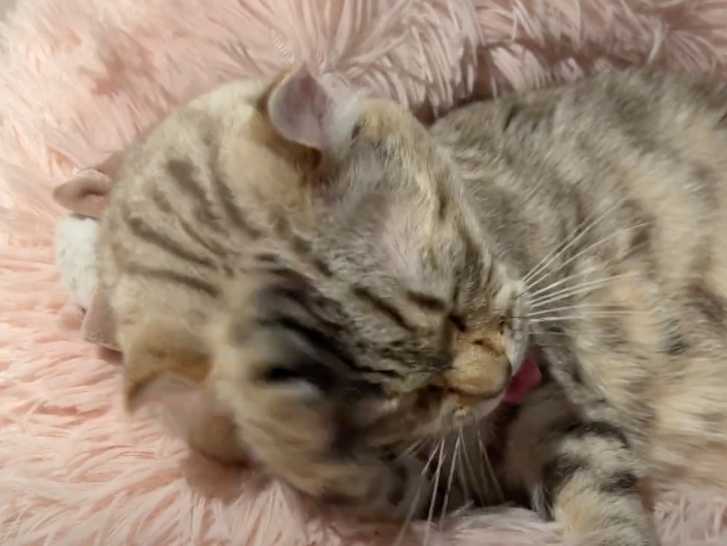 Cette vidéo montre un chat de race Desert Lynx en train de faire sa toilette quotidienne. En effet, le félin est installé confortablement sur un coussin rose et s'occupe de nettoyer son pelage. Il est allongé sur le ventre et s'occupe de son visage.