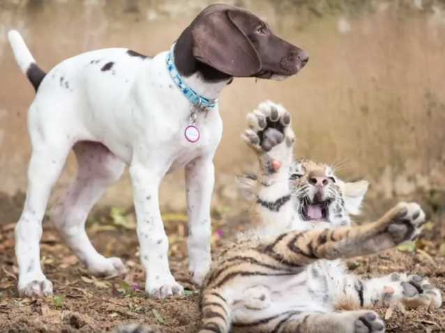 Hunter, un petit tigre né à Pretoria en Afrique du Sud, s'est lié d'amitié avec un jeune Braque Allemand à poil court du nom de Chelsea. Pour le moment, leurs jeux sont bien innocents, mais on peut déjà voir leur instinct respectif de chasseur s'exprimer. Il sera probablement nécessaire de les séparer quand ils auront grandi et seront devenus de véritables prédateurs.