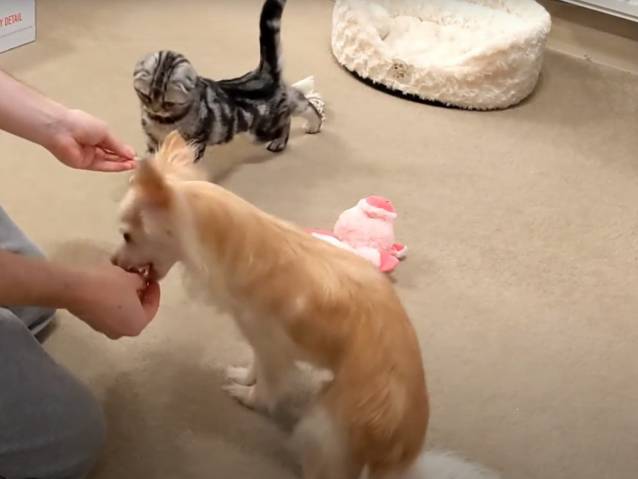 Cette vidéo met en lumière la tendre complicité entre un petit chien Chihuahua et un chien Scottish Fold. On les voit jouer ensemble sur le lit, sous le regard attentif de la maman du chaton installée dans un coin. C'est un moment attendrissant qui illustre à merveille l’amitié entre chiens et chats.