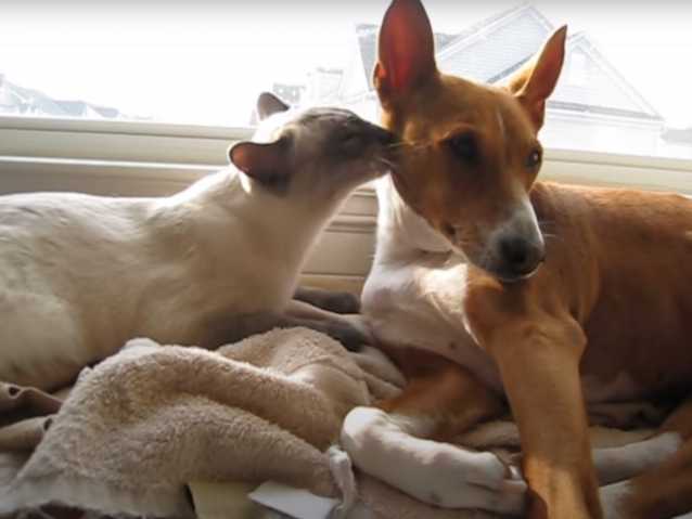 Voici un scène entre un Basenji et un chat qui est vraiment attendrissante. En effet, tandis que le chien se prélasse tranquillement dans son panier, son compagnon félin le toilette. Il lui lèche les oreilles, puis toute la tête, pour finir par son corps. Le chien apprécie et donc se laisse faire et le chat a l’air heureux de prendre soin de lui.
