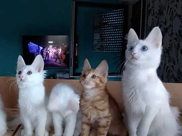 Cette vidéo montre une belle fratrie de chatons et de chats de race Angora Turc. Le propriétaire des félins les stimule grâce à un objet, ce qui permet de les éveiller et de les amuser.