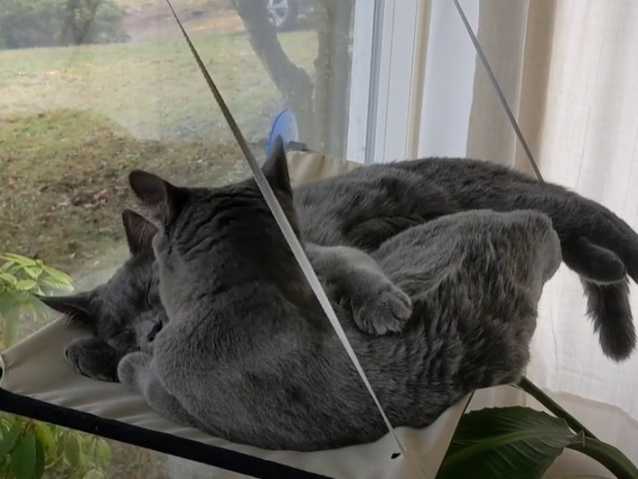 Le Bleu Russe est connu pour être très affecteux mais aussi très joueur. Cette vidéo montre des félins en train de se reposer et de se câliner entre eux sur un hamac de fenêtre : un vrai moment de tendresse !