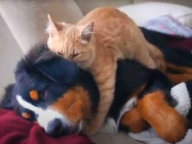 Bien agrippé au dos d'un Bouvier Bernois, un chat prend un grand plaisir à masser ce dernier. Très appliqué, le matou pétrit avec ses pattes le chien qui paraît apprécier. La scène est très tendre et les deux animaux sont très complices. Quelle belle amitié entre ce chien et ce petit félin !