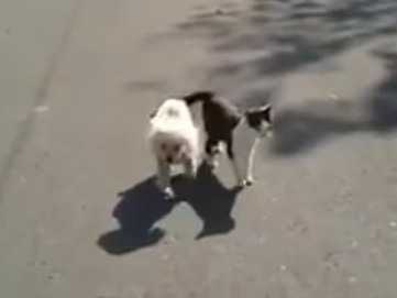 C'est une histoire d'amitié comme on en voit peu. Ce petit chien blanc de type Caniche est aveugle : les promenades et sorties en extérieur ne sont donc pas une partie de plaisir pour lui. Heureusement, un brave chat noir et blanc lui sert de guide et l'aide à se déplacer en se frottant à lui à intervalle régulier. Grâce à cela, le pauvre toutou peut retrouver son chemin jusqu'à la voiture de son maître.