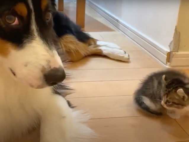 Un chaton American Curl tigré semble un peu perdu. Couché juste à côté, un Berger Australien regarde le petit être avec curiosité. Le chaton vient alors se réfugier sous la toison du chien, sans doute pour y trouver un peu de chaleur. Il y a fort à parier que ces deux-là seront amis pour toujours.