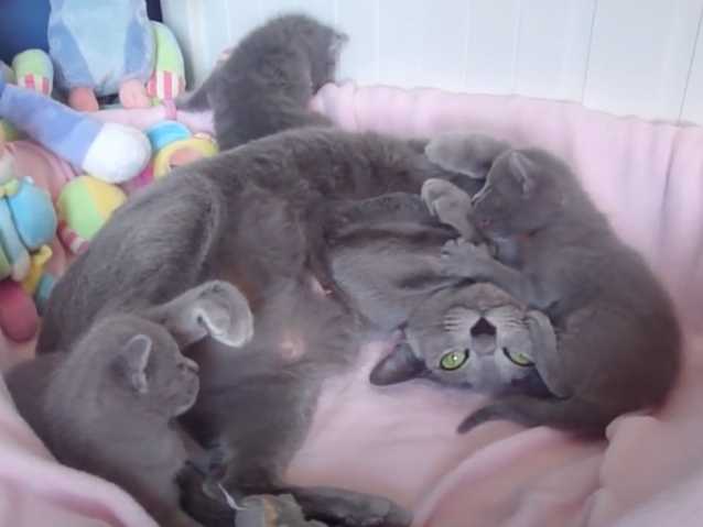 Durant les premières semaines de vie d'un chaton, il est nécessaire que celui-ci soit alimenté par sa mère. Cette vidéo permet justement d'être au coeur d'un moment de repas entre une chatte Bleu Russe et ses petits.