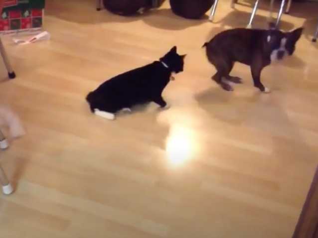 Voici un Boston Terrier et un Manx qui s’amusent ensemble comme des petits fous à l'intérieur de leur maison. Au cours de cette partie de jeu, ils réalisent des glissades sur le beau parquet de la pièce. Le chien et le chat se sautent également dessus à tour de rôle et se taquinent amicalement, mais sans aucune agressivité de part et d'autre.