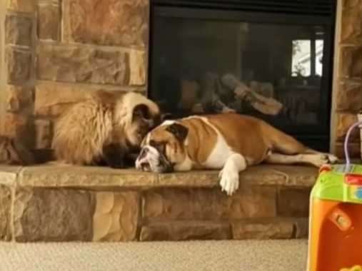 C’est au bord d'une belle cheminée de style rustique qu'un Bulldog Anglais se repose et se prélasse tranquillement. Malheureusement pour lui, l'Himalayen de la maison vient le déranger au cours de sa sieste. Il souhaite jouer avec lui et pour le lui faire savoir, le chat n'hésite pas à donner quelques coups de patte bien placés. Mais le chien ne veut rien entendre et reste impassible.