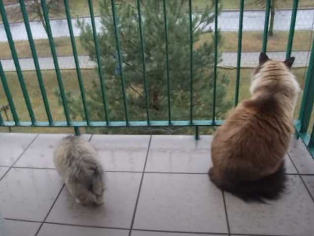 C’est sur le petit balcon d'un appartement qu'un chiot Epagneul Tibétain passe un moment en compagnie d'un chat Sibérien Neva Masquerade. En effet, ils observent tous les deux le paysage extérieur en se tenant côte à côte. C’est un moment touchant car ils font preuve d’une belle complicité digne d’un dessin animé.