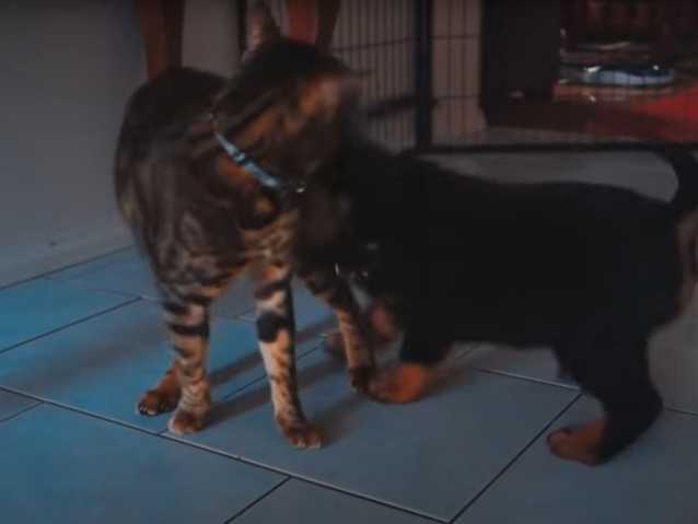 Voici un chiot Rottweiler et un chat Bengal qui s'amusent ensemble. Leur complicité ne fait aucun doute et ils vont être probablement amis pour la vie puisque la socialisation a été effectuée très tôt.