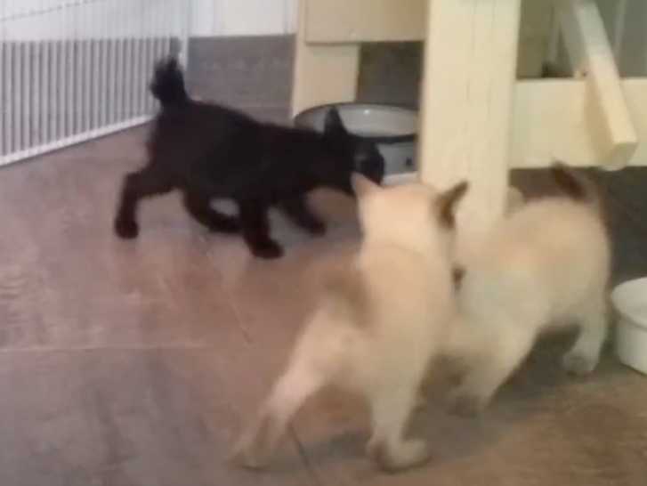 Cette vidéo montre une fratrie de chatons de race Toybob. Les petits félins de quelques semaines semblent s'entendre très bien car ils évoluent au sein d'une pièce de jeu dédiée avec beaucoup de malice. Ils n'hésitent pas à se taquiner de manière affectueuse : ils se donnent de petits coups de patte, se courent après et se sautent dessus.