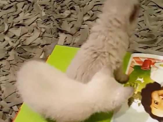 Cette vidéo montre une fratrie de chatons Desert Lynx en train de jouer sur un livre posé au sol. En effet, les félins semblent taquins entre eux : certains donnent des petits coups de pattes à d'autres.
