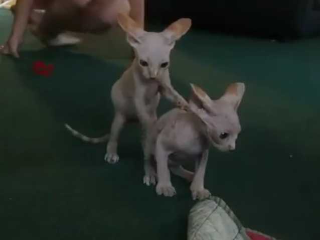 Cette vidéo montre deux chatons Kohana en train de jouer sous le regard amusé d’une petite fille. L’un commence à mordiller l’autre et tente de le faire tomber. Cela ne plaît pas à ce dernier qui le repousse. L’enfant en profite pour attirer son attention avec un serpentin sur lequel il bondit. Il est rapidement imité par son frère. Puis tous les deux se lassent et s’en vont dans une autre pièce de la maison.