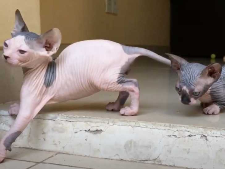 Cette vidéo montre deux chats de race Bambino qui se baladent tranquillement à l'extérieur de la maison de leur maitre. Les félins observent l'environnement qui les entoure et semble passer un agréable moment.