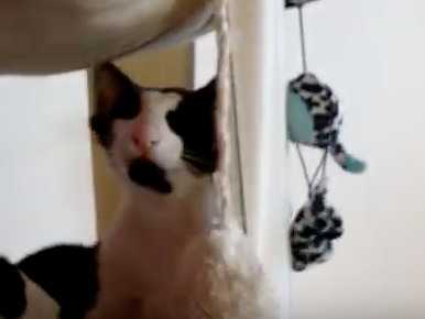 Deux chats de race Seychellois sont en pleine bagarre, perchés sur leur arbre à chat. Ils commencent alors une bataille de pattes, se tapant chacun à leur tour mais toujours dans une bonne ambiance, ne laissant aucun doute sur la caractère amical de cette interaction.