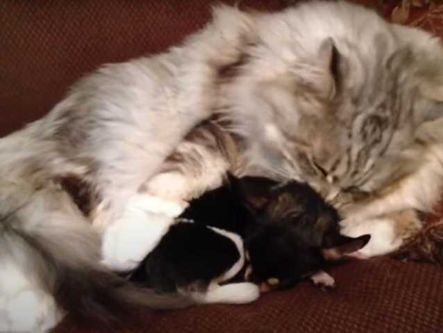 Telle une mère protégeant son bébé, voici un chat Maine Coon qui prend grand soin d'un Chihuahua. Ce dernier a l’air d’apprécier qu’on s’occupe de lui de la sorte. Ainsi, du bout de sa langue râpeuse, le félin lui fait la toilette comme il le ferait pour ses propres chatons. Le petit chien est manifestement aux anges.