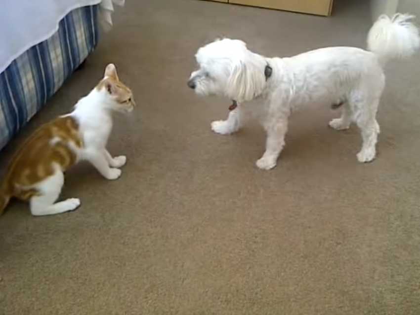 Même si le Mau Arabe est très sociable avec les animaux et les chiens, ce n’est pas pour autant qu’il va se laisser déranger. Ce Caniche blanc va vite le comprendre alors qu’il essaye de jouer avec le chat, qui va le chasser littéralement de la chambre.