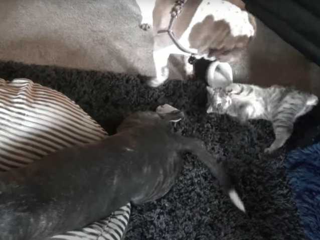 C’est au sein de l’intérieur cosy d'un appartement qu'un Pitbull et un Sharpeï jouent avec un chaton Pixie Bob. Ils se courent après en évitant les meubles et, tandis que les deux chiens montrent leur affection au petit félin en le léchant, le chaton s’amuse à attraper leurs queues respectives.
