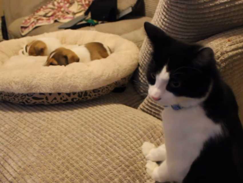 De nouveaux compagnons sont arrivés! Ce chat rencontre pour la première fois des chiots qui vont vivre sous le même toit. Si au début il est intrigué, il devient très rapidement curieux et les suit dans leur séance de jeu, typique des chiots de quelques mois. Une amitié vient de se créer.