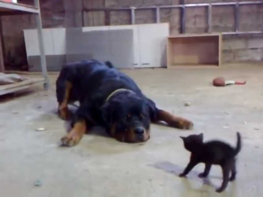 Bien qu’il soit beaucoup plus petit que lui, ce chaton ne se laisse pas impressionner par la taille et les aboiements de ce Rottweiler adulte. Hérissé, il se tient droit et répond aux attaques du chien qui cherche seulement à jouer avec son nouveau compagnon de jeu.