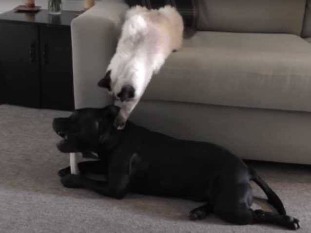 Un Staffordshire Bull Terrier mâchonne tranquillement un objet lorsqu'un Ragdoll attire son attention pour jouer. Ils ont visiblement l'habitude de jouer ensemble, mais on remarque toutefois de la part de leur maîtresse une légère inquiétude, puisqu'elle leur demande de se calmer un peu et préfère rappeler son chien. Il est vrai que ce dernier est nettement plus imposant que le félin et que cela pourrait en inquiéter plus d'un.