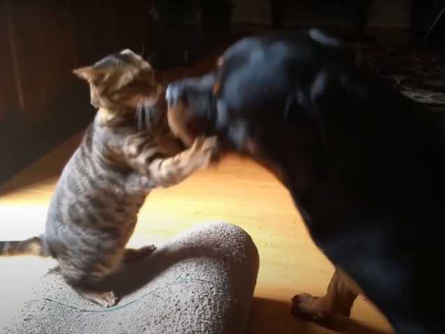 Voici un Bengal et un Rottweiler qui sont d’une complicité incroyable. Ainsi, on les voit jouer ensemble tel des frères, sans aucune animosité. D'ailleurs, le chat n'hésite pas à attraper les babines du molosse qui ne bronche aucunement. Une scène digne d’un dessin animé, drôle et tendre à la fois.