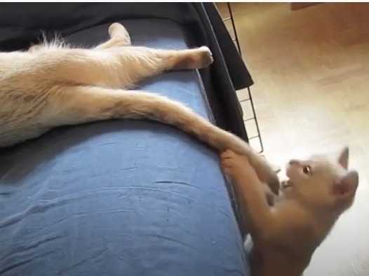 Faire cohabiter un chat avec un chaton peut s'avérer très rigolote. En effet, cette vidéo montre un chaton de race Burmilla en train de taquiner son compère qui est posé sur le canapé. Il essaie de lui attraper la queue et de la mordiller, chose que le chat ne trouve pas très amusant.