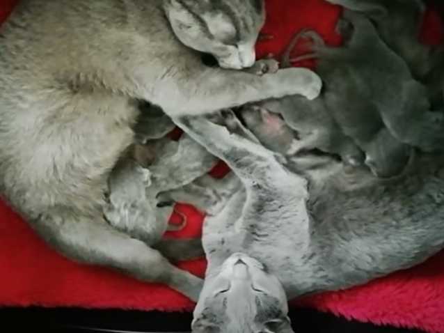La cohabitation entre chats peut être un vrai plaisir. C'est en effet le cas dans cette vidéo avec une famille Bleu Russe qui semble s'aimer à la folie. Les parents câlinent les chatons et petonent sur les petits félins. Un vrai moment de tendresse !